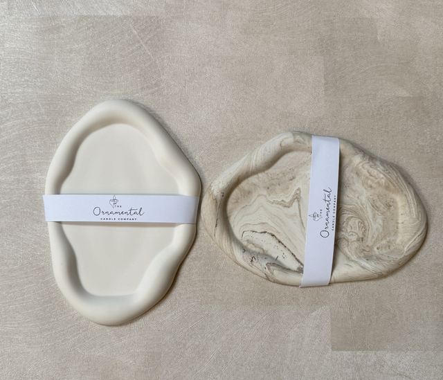 Elevate your home decor with our handcrafted trays, sculpted from eco-conscious Jesmonite resin, available in natural stone or neutral marble. Each tray is individually poured, sanded & sealed to resist light stains, then finished with cork pads to protect surfaces. A beautiful home for candles, perfumes, jewellery, keys, or keepsakes.